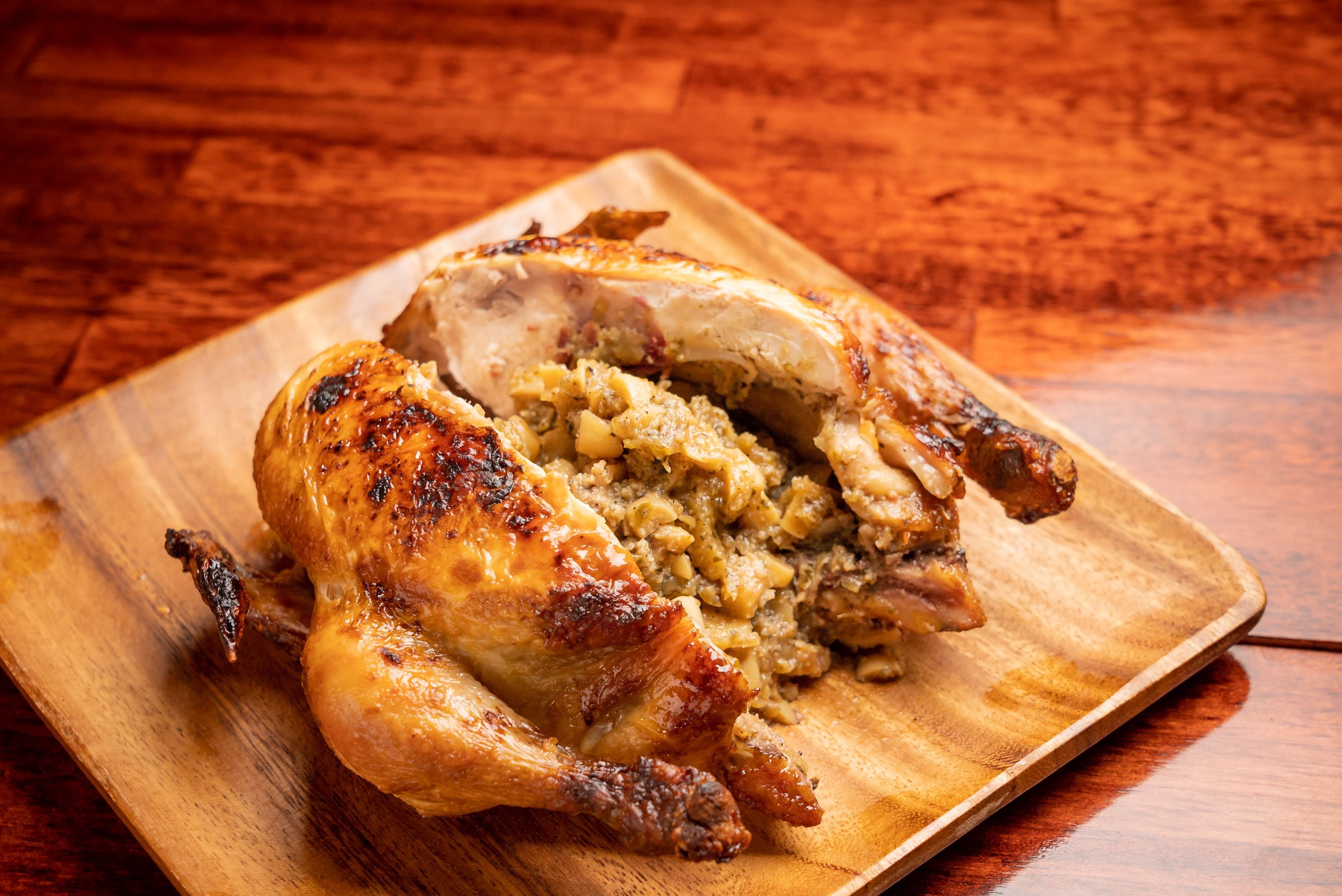 1kgほどの丸鶏をにんにくとハーブを詰め込んで特製のマリネ液でまるまる2日じっくり漬けこんで、ロティサリーオーブンでじっくり焼き上げた『チキンの丸焼き』です。
