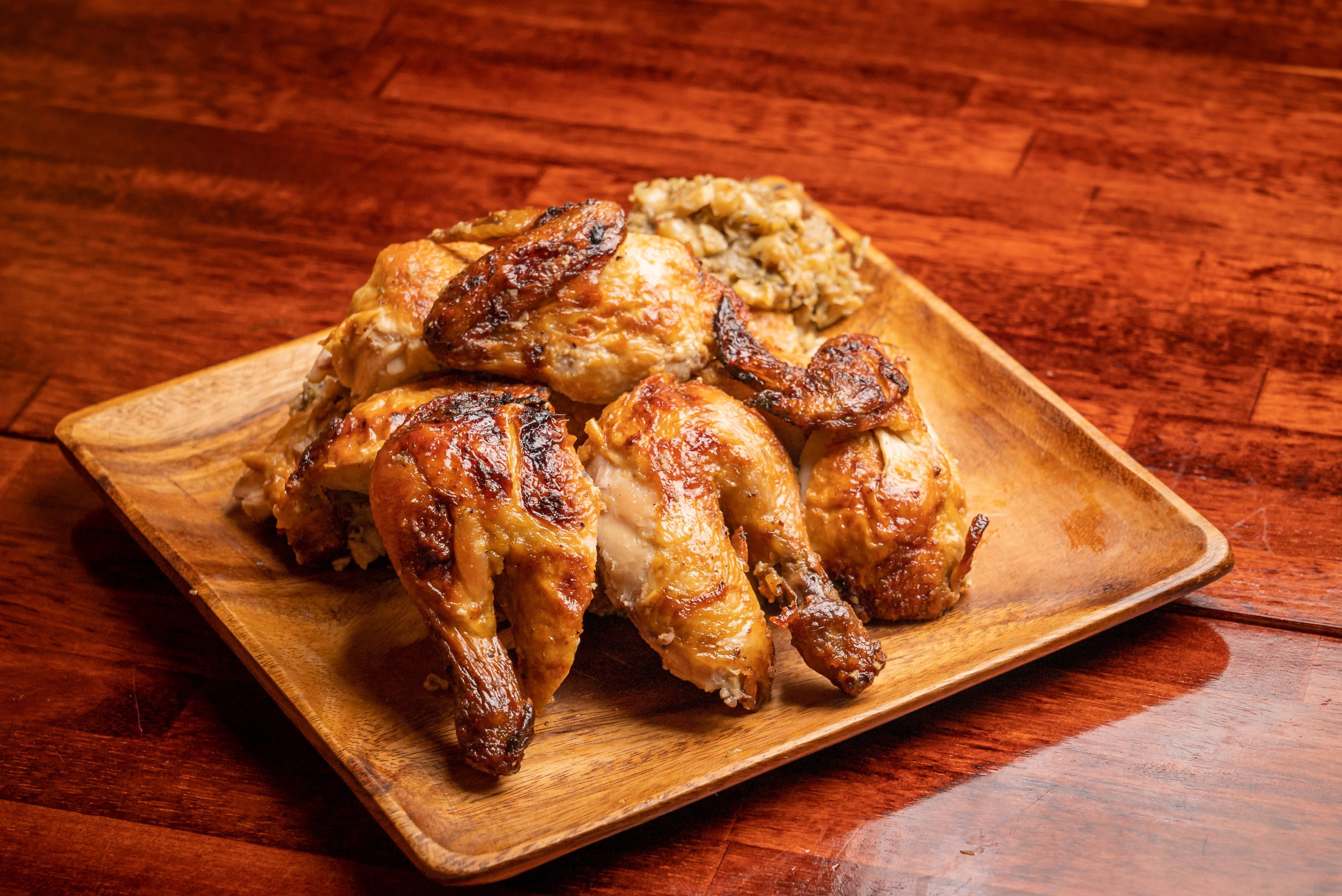 ゆっくりと脂を落としながら焼き上げるため、ふっくら、しっとりとした食感と、胸肉、手羽、ももなど鶏肉の様々な部位が一度にお楽しみいただけます。